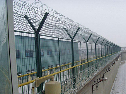 監(jiān)獄圍欄主要是采用高強(qiáng)度的刀片刺網(wǎng)與普通防護(hù)網(wǎng)的結(jié)合,由V型支架立拄,加強(qiáng)型焊接片網(wǎng),安全防盜連接件和刀片刺網(wǎng)組成.刀片刺網(wǎng)是一種新型防護(hù)網(wǎng),由銳利尖角鍍鋅鋼板或不銹鋼薄板做刀片,鋼絲做芯線組合而成的防護(hù)器材。