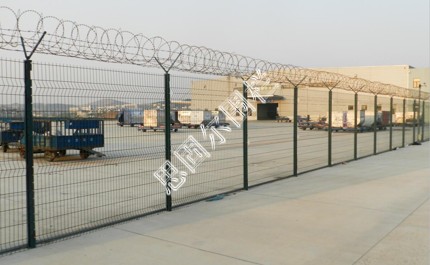 注:如果在飛機(jī)場(chǎng)圍欄頂部加裝刀片刺絲、刀片刺繩后又很好的增強(qiáng)了安全防護(hù)性能。采用電鍍、熱鍍、噴塑、浸塑等防腐形式,具有很好的抗老化、抗曬、耐候等特點(diǎn)。其產(chǎn)品造型美觀、花色多樣,既起到圍欄作用,又起到美化作用。由于具有安全性高、防攀爬能力好,網(wǎng)片連接方式采用特制SBS緊扣件,有效防止人為的破壞性拆卸,橫向四道折彎加強(qiáng)筋,使網(wǎng)面強(qiáng)度顯著增加。