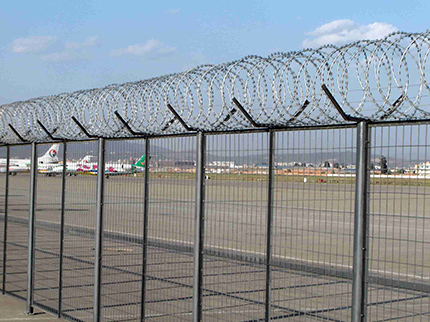 飛行區鋼筋網圍界一般采用5.0mm的優質低碳鋼絲焊接;網孔(mm) 50x100 50x150 50x200網片中帶有Y型加強筋可增強護欄網的抗沖擊力。立柱為60X60矩形鋼,頂端含有Y型支架或者采用70mmX100mm的掛式連接立柱,飛行區鋼筋網圍界網片鏈接采用特制SBS扣件,有效防止人為破壞性拆卸,產品均為熱鍍鋅后采用高質量的聚酯粉末靜電噴涂,采用國際流行的RAL顏色,飛行區鋼筋網圍界主要用途:機場封閉 、私人地域、軍事重地、 場區圍網、 開發區隔離網使用;